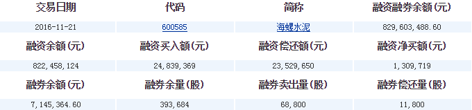 海螺水泥(600585)2016-11-21融資融券信息顯示,海螺水泥融資余額822,458,124元,融券余額7,145,364.60元,融資買(mǎi)入額24,839,369元,融資償還額23,529,650元,融資凈買(mǎi)額1,309,719元,融券余量393,684股,融券賣(mài)出量68,800股,融券償還量11,800股,融資融券余額829,603,488.60元。海螺水泥融資融券詳細(xì)信息如下表:
