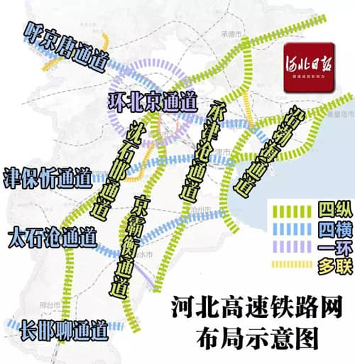 加快境內(nèi)高速鐵路網(wǎng)主通道及區(qū)域連接線項目建設(shè),大力發(fā)展城際鐵路,強化鐵路客運樞紐與機場、城市軌道交通的便捷聯(lián)接,構(gòu)建內(nèi)嵌京津,外聯(lián)東北、西北、華中、華東四個主要方向的“四縱四橫一環(huán)多聯(lián)”高速鐵路網(wǎng)。