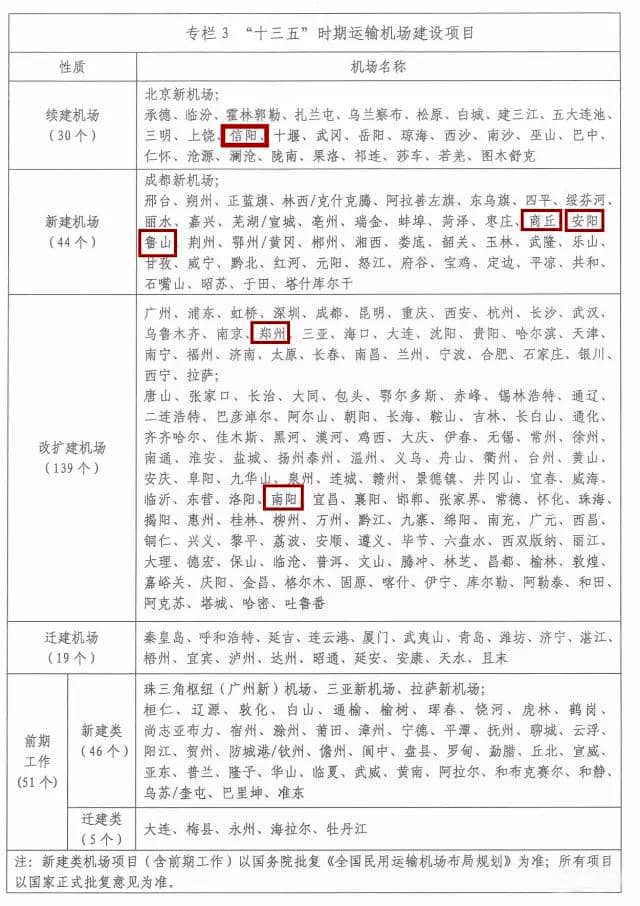 在《規劃》“十三五”時期運輸機場建設項目的表格中,續建機場項目有30個,其中包括信陽市續建機場項目;新建機場項目44個,其中包括河南省商丘、安陽、魯山新建機場項目;改擴建機場項目達到139個,其中包括河南省鄭州市、南陽市改擴建機場項目。