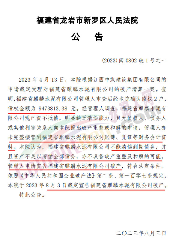 8月3日,福建省龍巖市新羅區(qū)人民法院發(fā)布公告稱:2023年4月13日,根據(jù)江西中煤建設(shè)集團(tuán)有限公司的申請(qǐng)裁定受理對(duì)福建省麒麟水泥有限公司的破產(chǎn)清算一案。