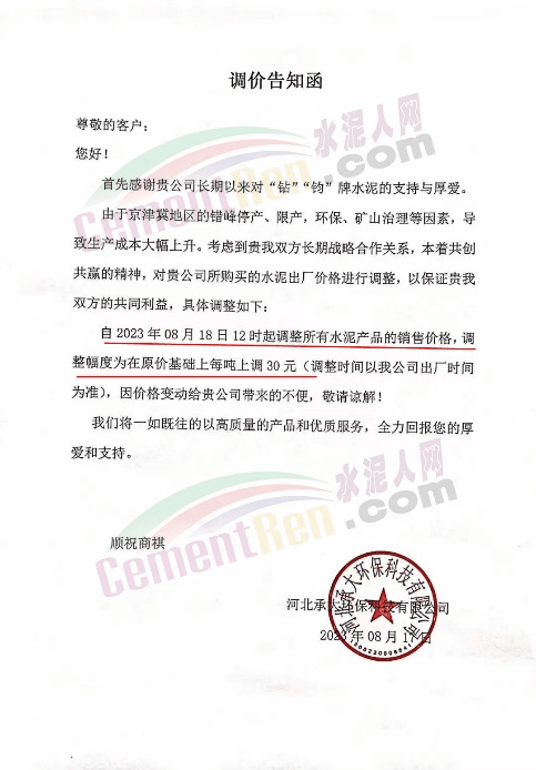 河北承大環??萍加邢薰就ㄖ?,由于京津冀地區的錯峰停產、限產,環保、礦山治理等因素,導致生產成本大幅上升。自2023年8月18日12時起調整所有水泥產品的銷售價格,調整幅度為在原價基礎上每噸上調30元。