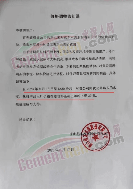 天津山水水泥有限公司通知稱,受原材料及運輸高成本影響,導致公司水泥制造成本居高不下。為保障公司正常生產運行,繼續為客戶提供優質產品及服務,經研究決定自2023年8月18日起所有品種水泥出廠價在原價格基礎上上調30元/噸。