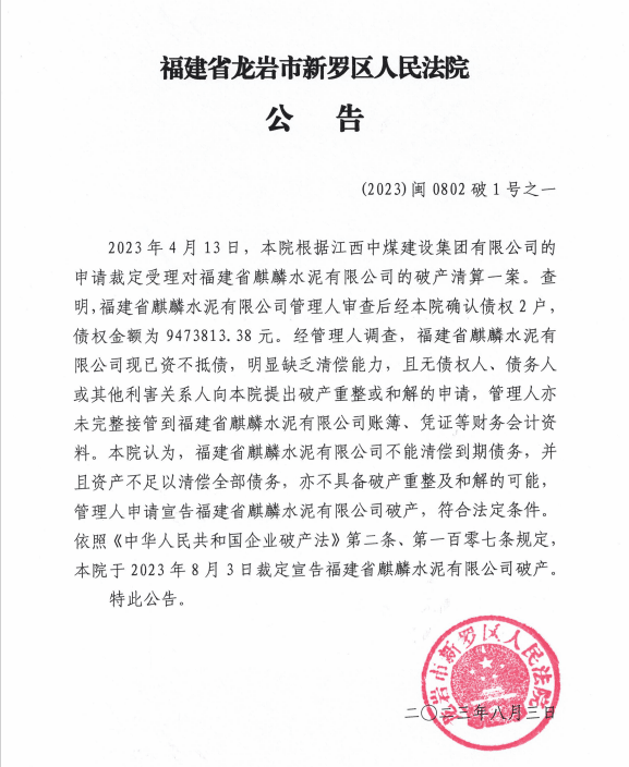 8月4日,福建省龍巖市新羅區人民法院公告,福建省麒麟水泥有限公司不能清償到期債務,并且資產不足以清償全部債務,亦不具備破產重整及和解的可能,管理人申請宣告福建省麒麟水泥有限公司破產,本院于裁定宣告福建省麒麟水泥有限公司破產。