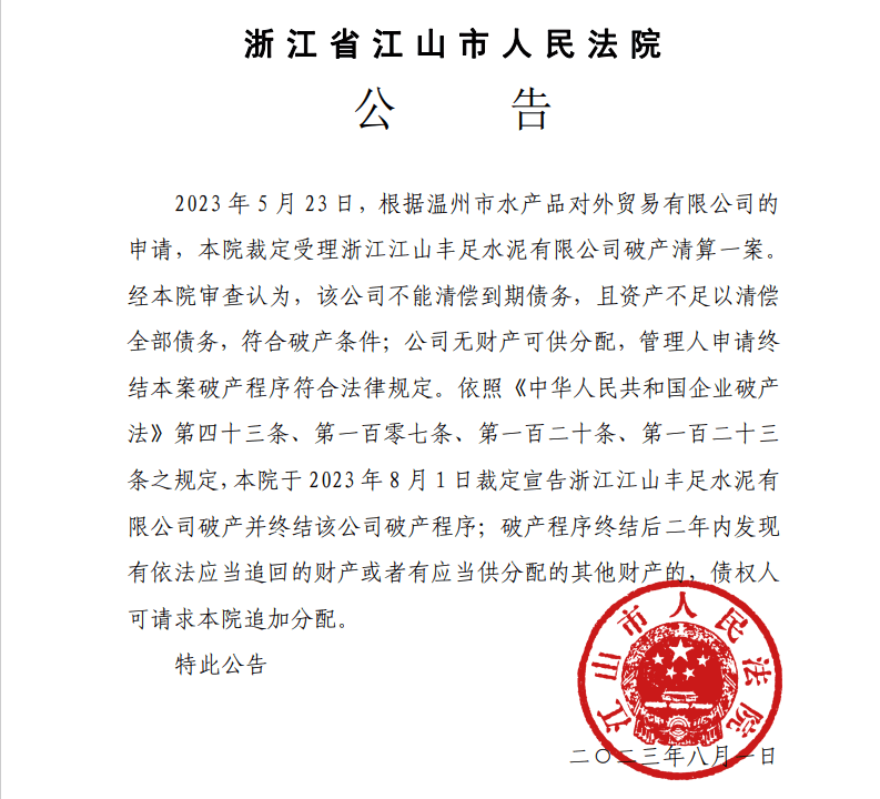 8月2日,浙江省江山市人民法院公告,經本院審查認為,浙江江山豐足水泥有限公司不能清償到期債務,且資產不足以清償全部債務,符合破產條件;公司無財產可供分配,管理人申請終結本案破產程序符合法律規定,本院裁定宣告浙江江山豐足水泥有限公司破產并終結該公司破產程序。