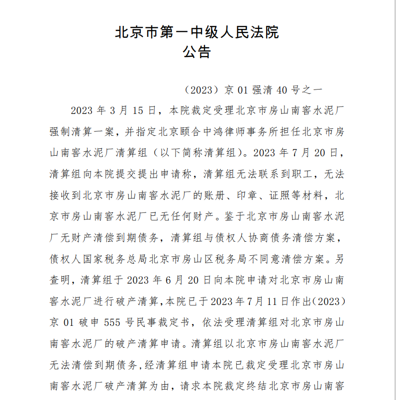 7月21日,北京市第一中級人民法院公告,本院于 2023 年7月21日確認北京市房山南窖水泥廠清算報告并裁定終結北京市房山南窖水泥廠強制清算程序。