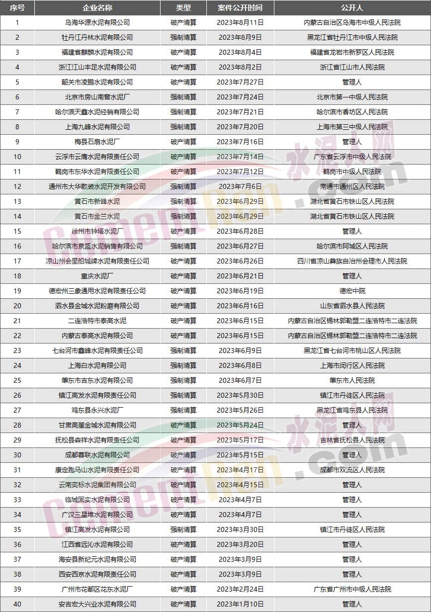 據水泥人網不完全統計,今年以來,40家水泥企業,25家混凝土企業,9家砂石企業宣布破產或已進入破產程序。