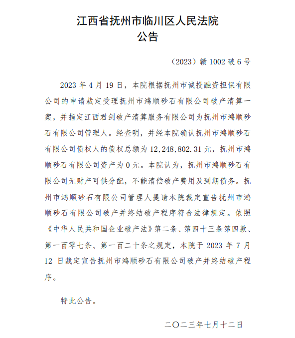 7月12日,江西省撫州市臨川區人民法院公告,本院認為,撫州市鴻順砂石有限公司無財產可供分配,不能清償破產費用及到期債務。撫州市鴻順砂石有限公司管理人提請本院裁定宣告撫州市鴻順砂石有限公司破產并終結破產程序符合法律規定。本院于2023年7月12日裁定宣告撫州市鴻順砂石有限公司破產并終結破產程序。