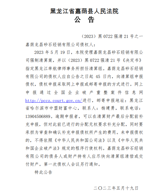 5月19日,黑龍江省嘉蔭縣人民法院公告,2023 年 5 月 19 日,本院受理嘉蔭龍昌砂石經銷有限公司強制清算案,并指定黑龍江率航律師事務所擔任清算組。嘉蔭龍昌砂石經銷有限公司的債權人應自公告之日起 45 日內,向清算組申報債權。