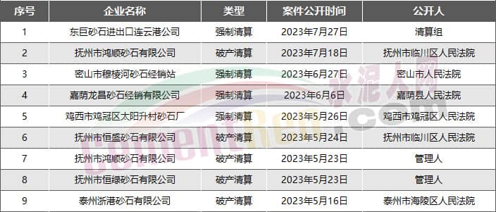 9家砂石企業宣布破產或進入破產程序