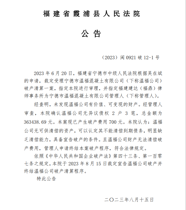 8月15日,福建省霞浦縣人民法院公告,寧德市溫?;炷劣邢薰緹o可供清償的資產,可以認定其不能清償到期債務,明顯缺乏清償能力,具備宣告破產的條件。且溫福公司財產無法清償破產費用,管理人申請終結本案破產程序,符合法律規定。本院于 2023 年 8 月 15 日裁定宣告溫福公司破產并終結溫福公司破產清算程序。