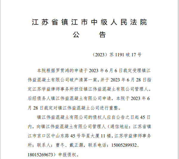 8月4日,江蘇省鎮江市中級人民法院公告,本院于2023年6月6日裁定受理鎮江偉益混凝土有限公司破產清算一案,并于2023年6月28日裁定對鎮江偉益混凝土公司進行重整,本院定于2023年9月28日上午9時30分在本院大法庭通過現場和網絡直播的方式召開第一次債權人會議。
