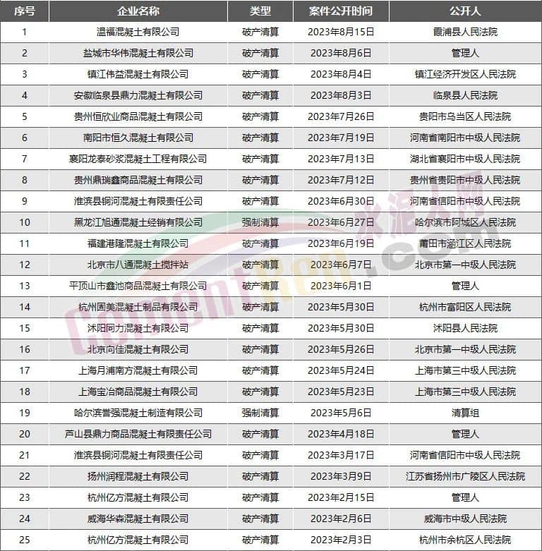 25家混凝土企業宣布破產或進入破產程序
