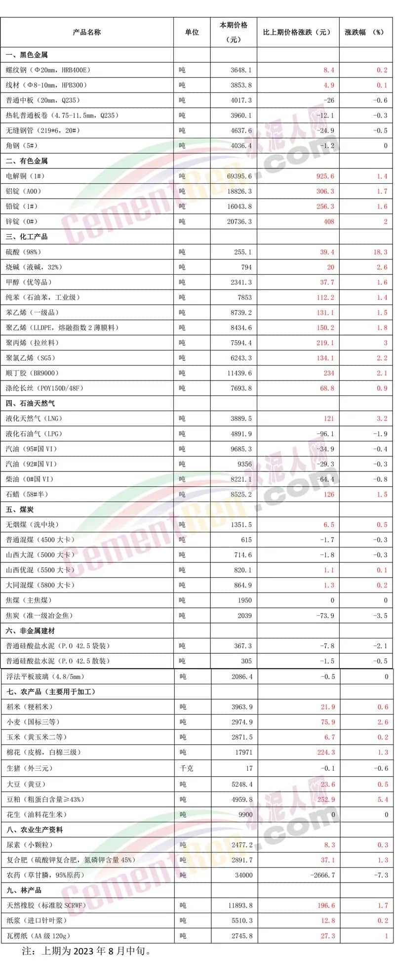 根據國家統計局公布的8月下旬流通領域重要生產資料市場價格變動情況,2023年8月下旬與8月中旬相比,32種產品價格上漲,14種下降,4種持平。價格上漲產品較8月中旬的25種增加了7種 。
