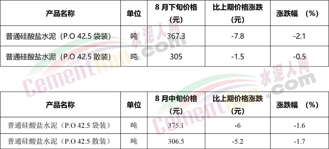 8月17日,河南鄭州水泥價格陸續下跌20元/噸