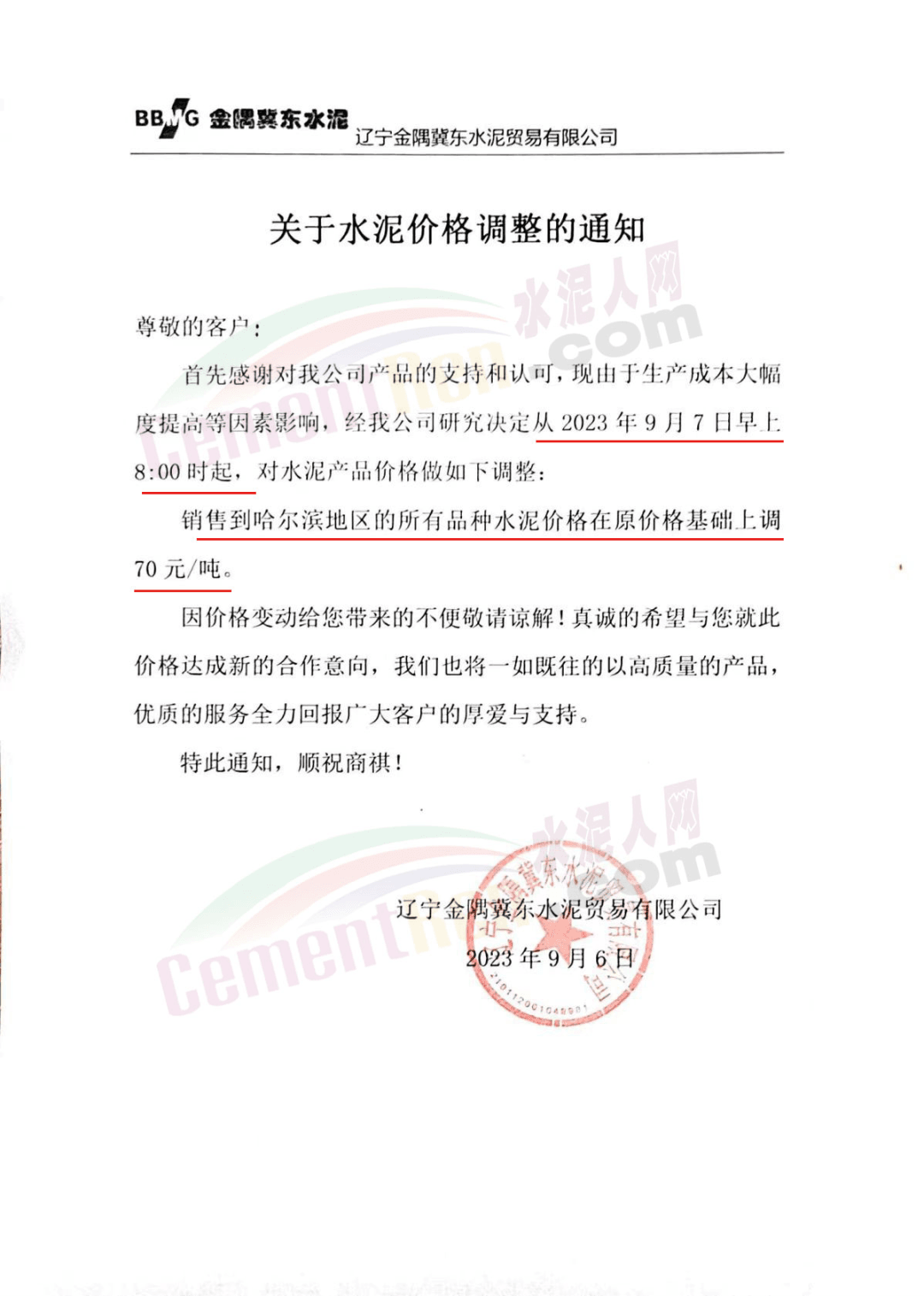 遼寧金隅冀東水泥貿(mào)易有限公司通知,由于生產(chǎn)成本大幅度提高等因素影響,經(jīng)公司研究決定從2023年9月7日早上8時起,對銷售到哈爾濱地區(qū)的所有品種水泥價格在原價格基礎(chǔ)上上調(diào)70元/噸。