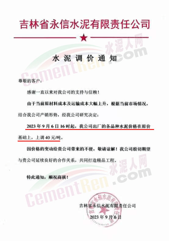吉林省永信水泥有限責任公司通知由于當前原材料成本及運輸成本大幅上升,根據(jù)當前市場情況,結(jié)合公司產(chǎn)銷形勢,經(jīng)研究決定:2023年9月6日16時起,公司出廠的各品種水泥價格在原價基礎(chǔ)上,上調(diào)40元/噸。
