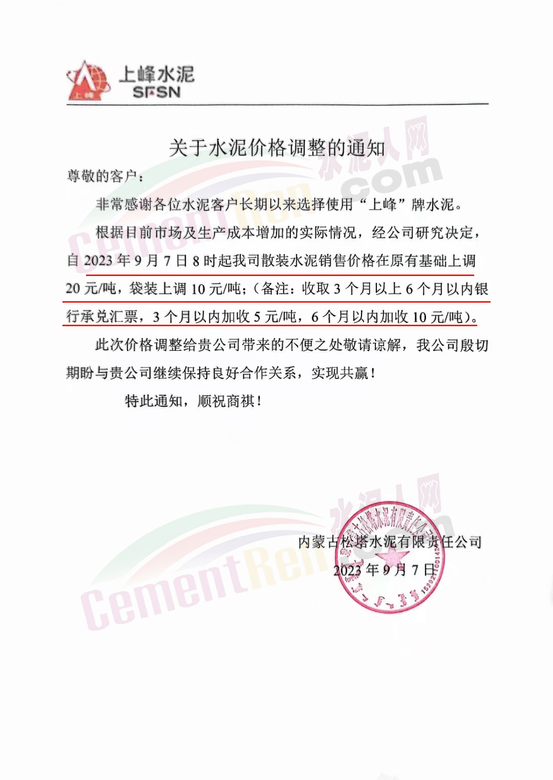 內(nèi)蒙古松塔水泥有限責任公司通知,根據(jù)目前市場及生產(chǎn)成本增加的實際情況,經(jīng)公司研究決定自2023年9月7日8時起散裝水泥銷售價格在原有基礎(chǔ)上調(diào)20元/噸,袋裝上調(diào)10元/噸;并提示,收取3個月以上6個月以內(nèi)銀行承兌匯票,3個月以內(nèi)加收5元/噸,6個月以內(nèi)加收10元/噸。