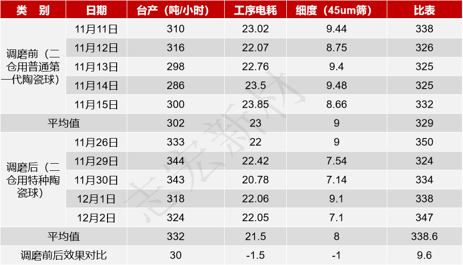 茂鑫HS水泥企業4.6*14.5米磨機二倉原用普通第一代陶瓷球改用第三代特種陶瓷球后,臺產提高30.3t/h,增產幅度10%;粉磨工序電耗降低1.5度/噸,下降幅度6.5%;入庫水泥45μm篩余細度降低1.0,比表面積提高9.6。