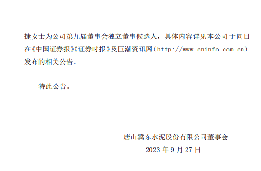 冀東水泥發公告稱,董事會于近日收到獨立董事孔祥忠先生、姚頤女士的書面辭職報告。因連續擔任獨立董事已滿六年,根據相關監管規定,孔祥忠先生、姚頤女士向董事會提出辭去本公司第九屆董事會獨立董事職務,同時一并辭去董事會專門委員會相關職務。辭職后,孔祥忠先生、姚頤女士將不再任職于本公司。孔祥忠先生、姚頤女士確認其與公司及董事會無不同意見,亦無任何有關其辭任須提請公司股東注意的事宜。