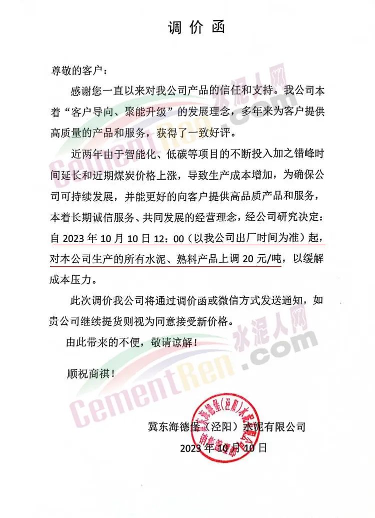 冀東水泥銅川有限公司、冀東海德堡(涇陽)水泥有限公司通知稱,近兩年由于智能化、低碳等項目的不斷投入加之錯峰時間延長和近期煤炭價格上漲,導致生產成本增加,為確保公司可持續發展,并能更好地向客戶提供高品質產品和服務,本著長期誠信服務、共同發展的經營理念,經公司研究決定自2023年10月10日12時起,對本公司生產的所有水泥、熟料產品上調20元/噸,以緩解成本壓力。