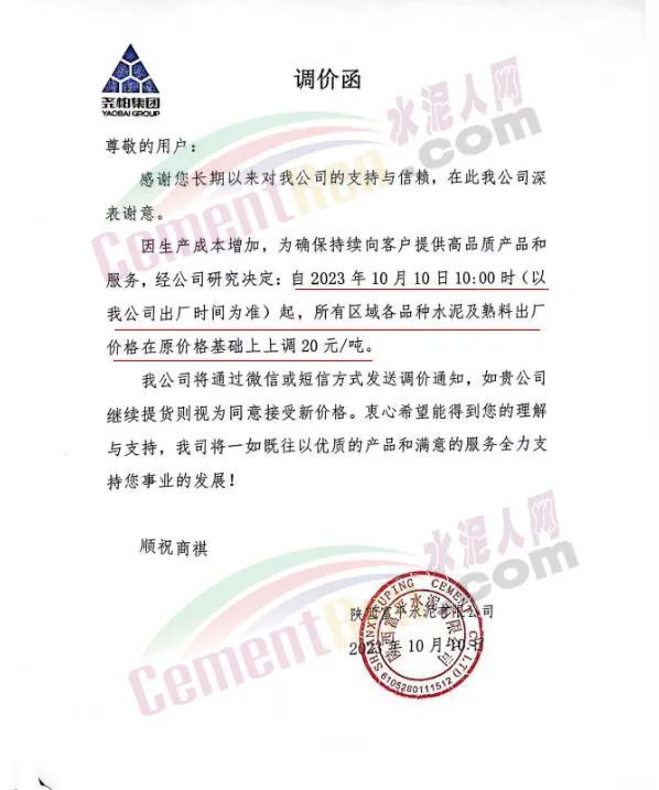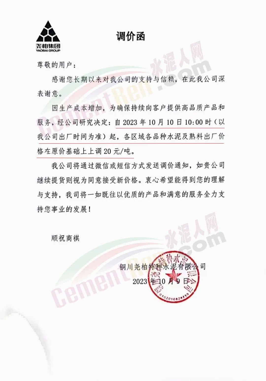 堯柏集團旗下銅川堯柏特種水泥有限公司、陜西富平水泥有限公司通知,因生產成本增加,為確保持續向客戶提供高品質產品和服務,經公司研究決定,自2023年10月10日10時起,所有區域各品種水泥及熟料出廠價格在原價格基礎上上調20元/噸。
