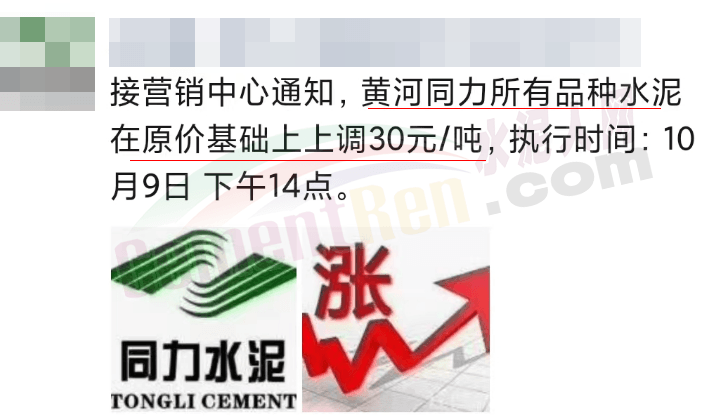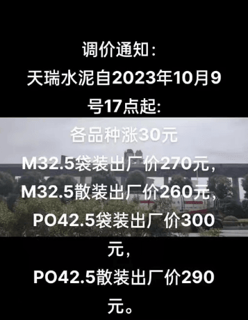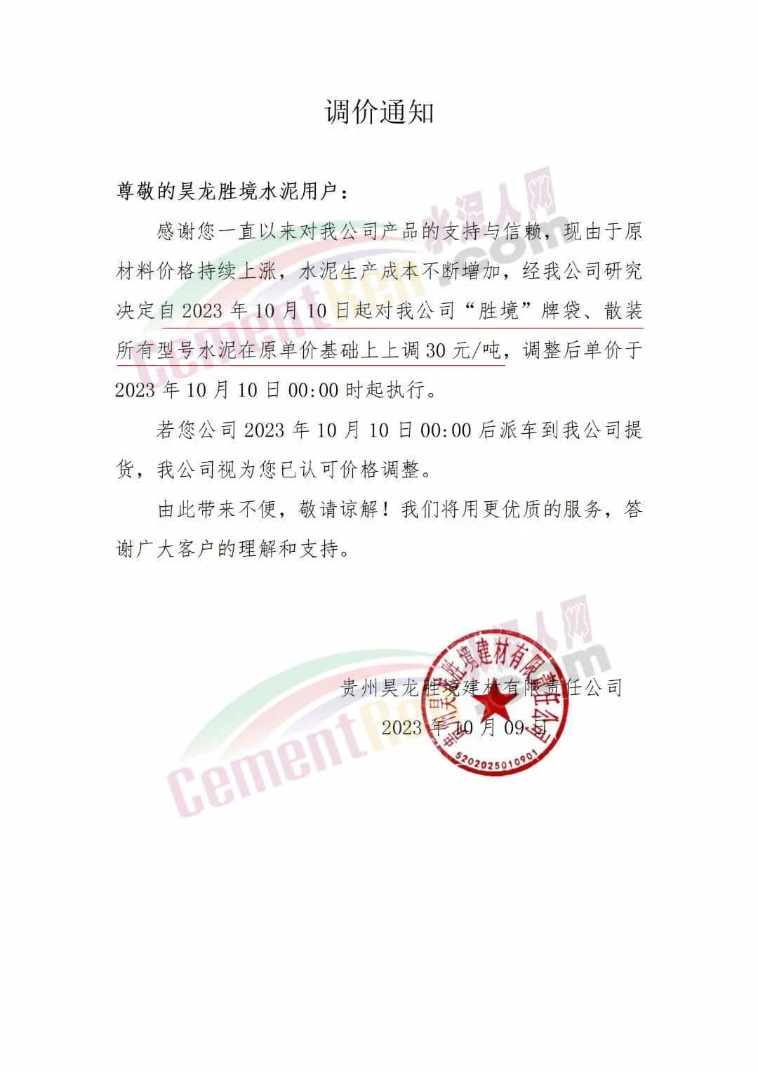 同日,貴州昊龍勝境建材有限責任公司通知,由于原材料價格持續上漲,水泥生產成本不斷增加,經公司研究決定自2023年10月10日0時起對公司“勝境”牌袋、散裝所有型號水泥在原單價基礎上上調30元/噸。