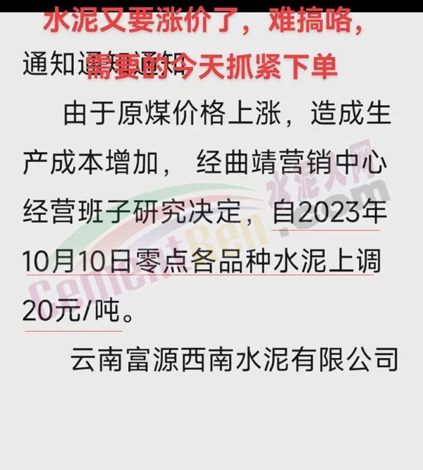 云南富源西南水泥有限公司通知,由于原煤價格上漲,造成生產成本增加,經曲靖營銷中心經營班子研究決定,自2023年10月10日零點各品種水泥上調20元/噸。
