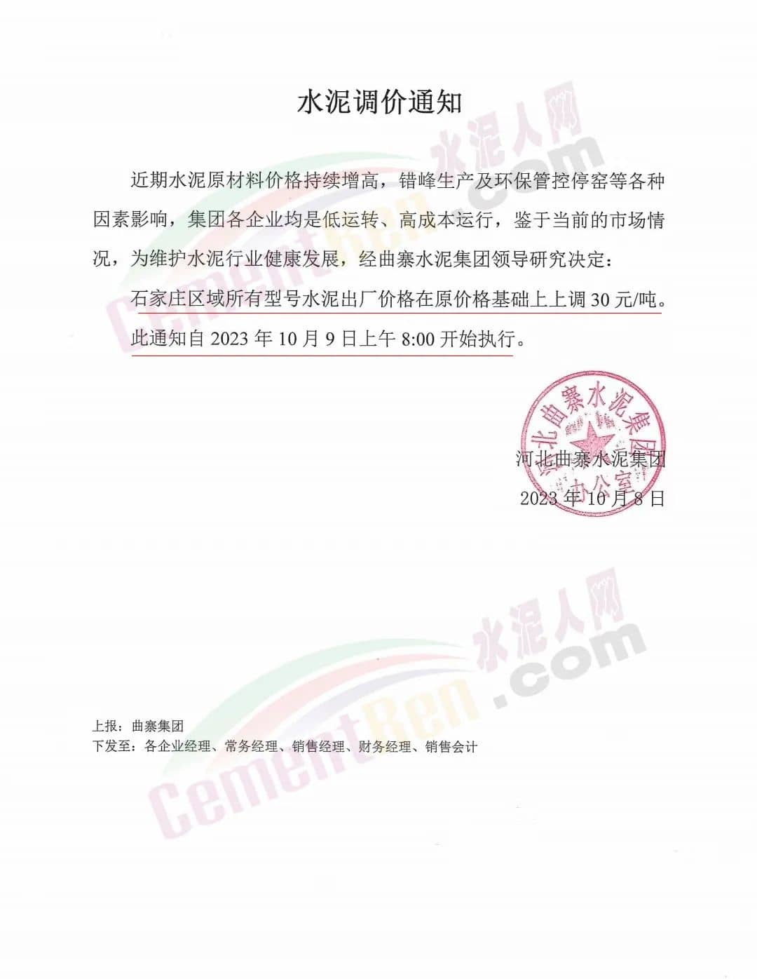 河北曲寨水泥集團通知,近期水泥原材料價格持續增高,錯峰生產及環保管控停窯等各種因素影響,集團各企業均是低運轉、高成本運行,鑒于當前的市場情況,為維護水泥行業健康發展,經曲寨水泥集團領導研究決定,自2023年10月9日上午8時起,石家莊區域所有型號水泥出廠價格在原價格基礎上上調30元/噸。