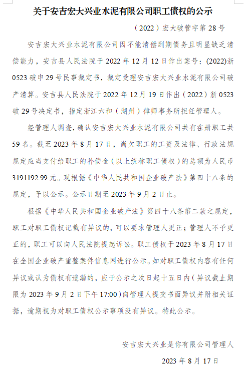 8月17日,安吉宏大興業水泥有限公司管理人發公示消息稱,經調查確認安吉宏大興業水泥有限公司共有在冊職工共59名。截至2023年8月17日,尚欠職工的工資及法律、行政法規規定應當支付給職工的補償金(以上統稱職工債權)的總額為人民幣3191192.99元。