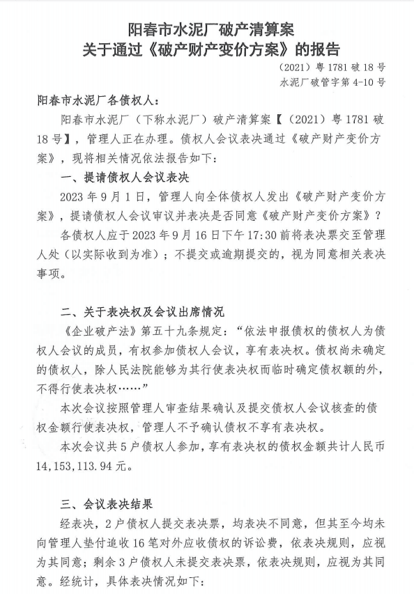 陽春市水泥廠破產清算,債務人3:2通過《破產財產變價方案》的報告