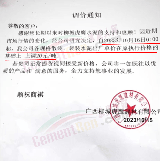 廣西柳城虎鷹建材有限公司通知,因近期市場行情的變化,經公司研究決定,自2023年10月16日0時起,公司各規格散裝,袋裝水泥出廠單價在原執行價格基礎上上調20元/噸。