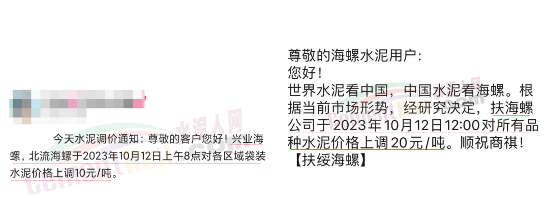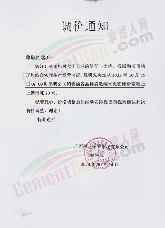 廣西新建線企業錦象水泥通知,因原材料價格上漲,導致公司成本增加,經研究決定,于2023年10月14日起,各品種包、散水泥價格上調20元/噸。