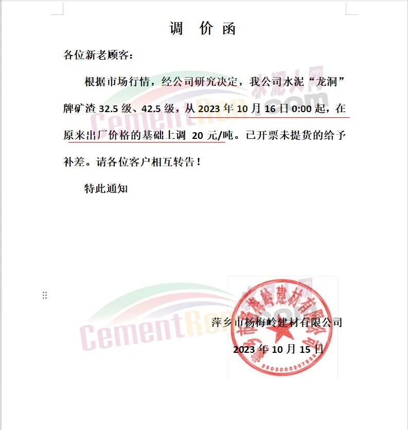 江西吉州南方水泥吉安青原區分公司通知,根據當前市場行情,經公司研究決定,自2023年10月15日8時起,各標號水泥上調20元/噸。