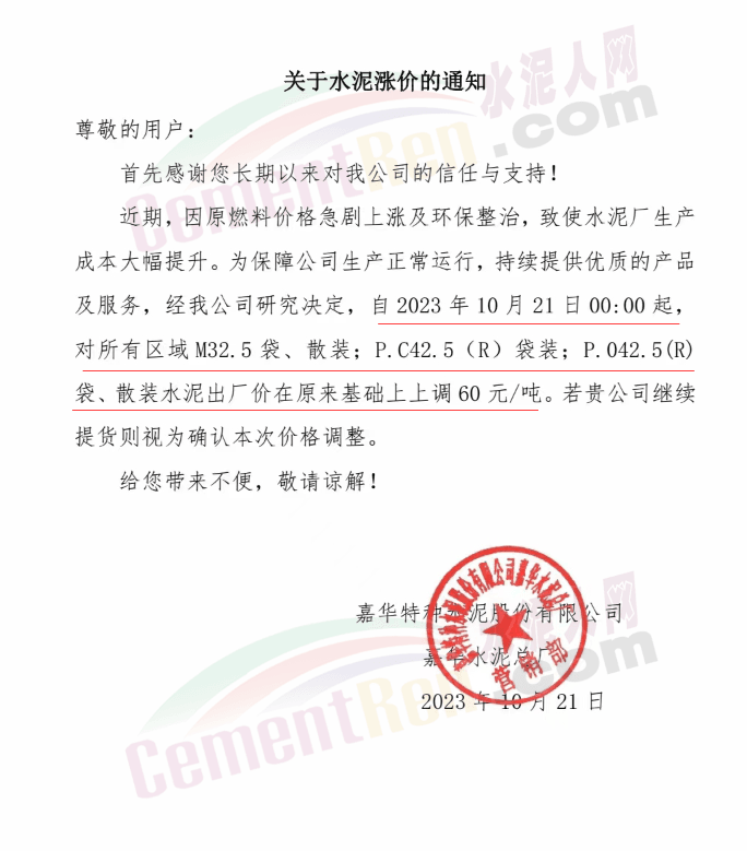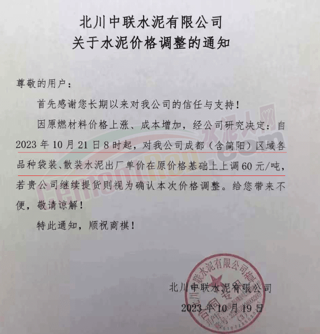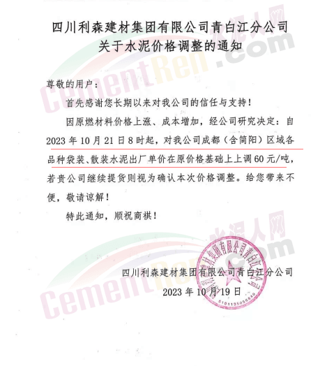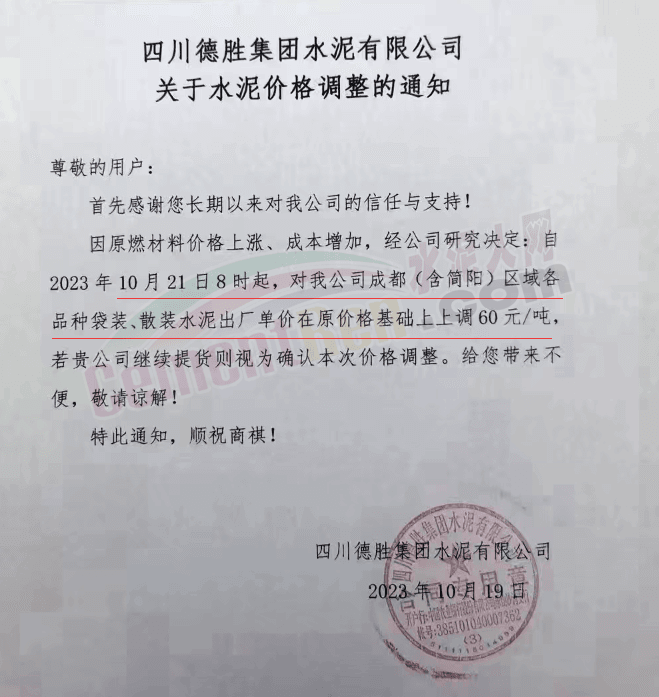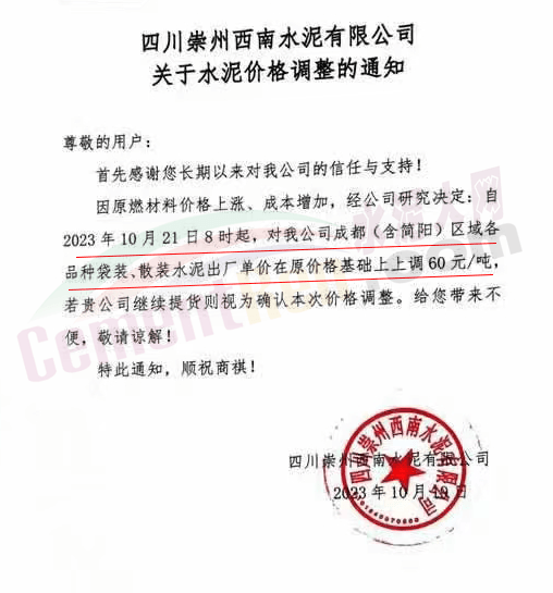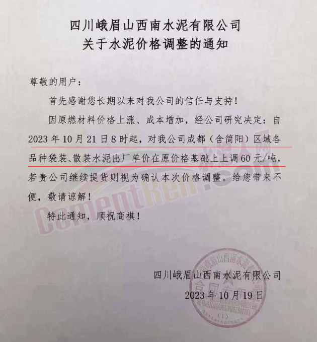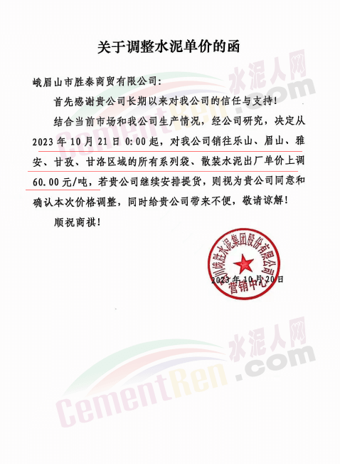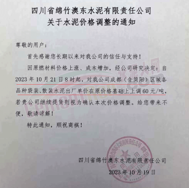 水泥人網(wǎng)通訊員消息:日前,四川大成都區(qū)域主要品牌企業(yè)通知自2023年10月21日起上調各品種水泥出廠價60元/噸。