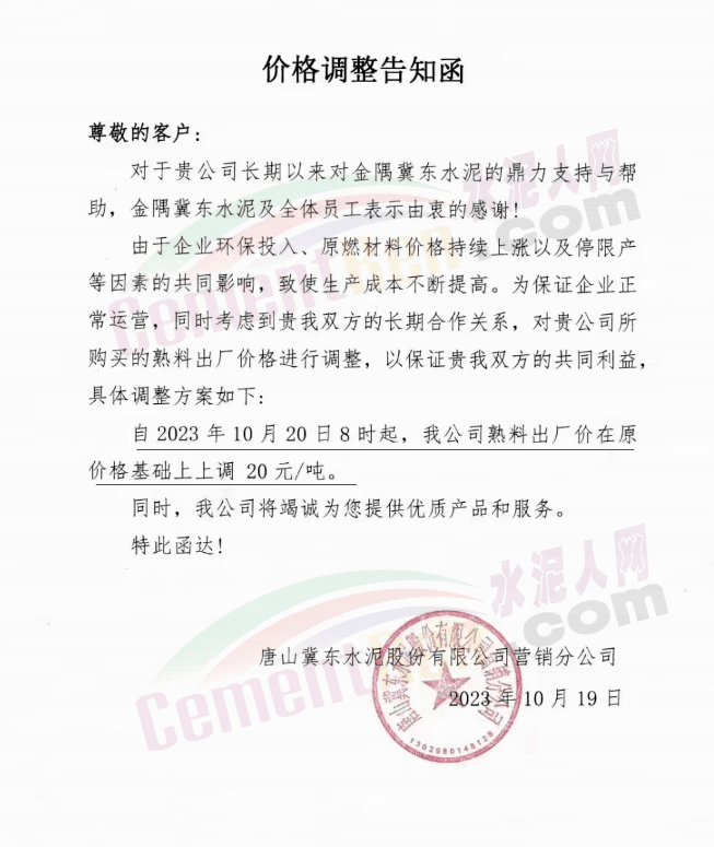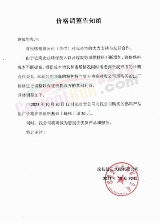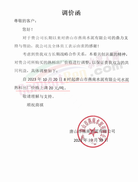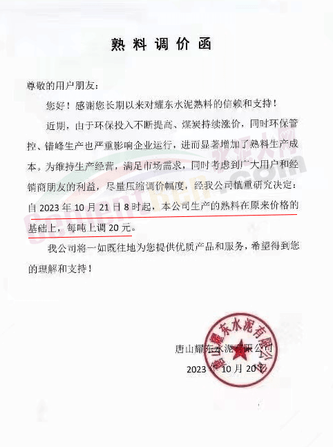 同期,河北唐山冀東水泥、耀東水泥、燕東水泥、燕南水泥、磐石水泥等多家企業(yè)通知上調熟料報價20元/噸。