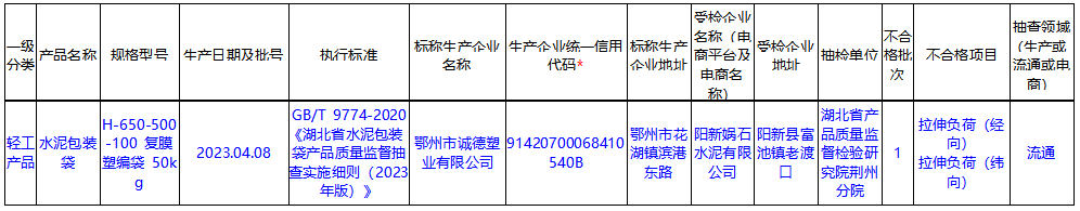 10月13日,湖北省市場監督管理局通報標稱生產企業名稱為鄂州市誠德塑業有限公司的一個批次水泥包裝袋產品不合格,不合格項目為拉伸負荷,不合格品受檢企業為陽新媧石水泥有限公司。