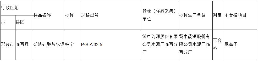 9月4日,河北省市場監督管理局通報標稱生產單位為冀中能源股份有限公司水泥廠臨西分廠的1批次“詠寧”牌礦渣硅酸鹽水泥(PSA.32.5)氯離子項目不合格。