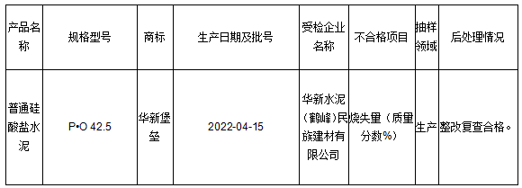 2023年8月16日,湖北省市場監管局網站通報,華新水泥(鶴峰)民族建材有限公司一批次P.O42.5水泥燒失量不合格。