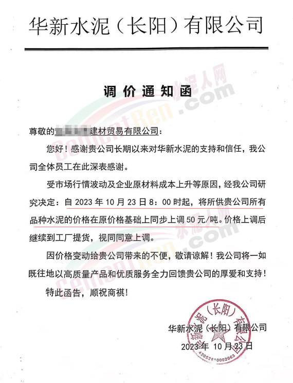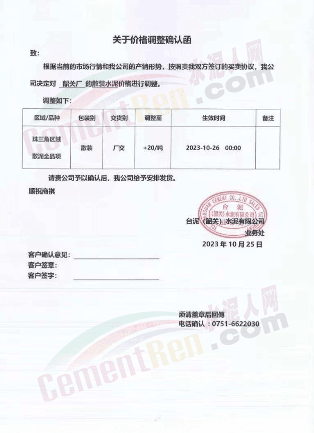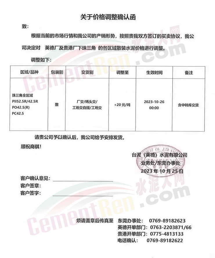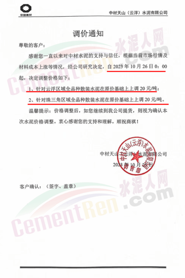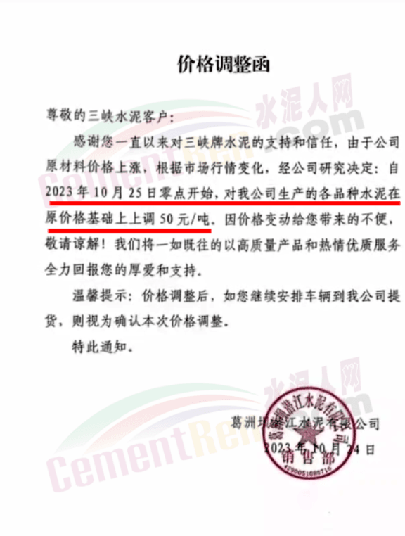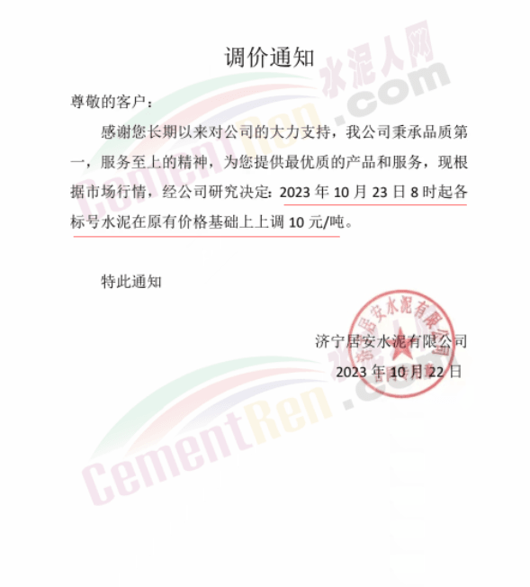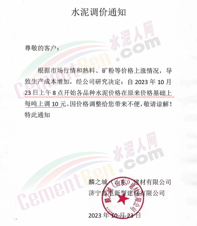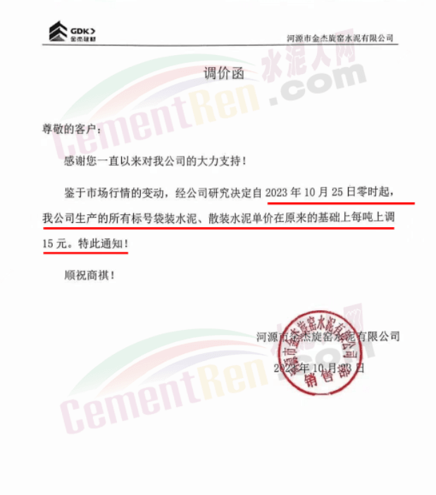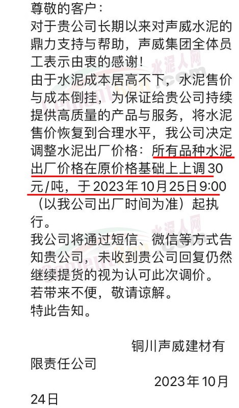 金隅冀東經貿公司通知,由于近期原材料持續上漲,生產能耗成本增加,導致公司生產成本增加。為維持企業正常生產經營,保障項目水泥供應,經研究決定自2023年10月23日8時起,將米脂冀東水泥有限公司、山西金隅冀東環??萍加邢薰景l往榆林市、延安市所有市場各品種水泥出廠價上調30元/噸。