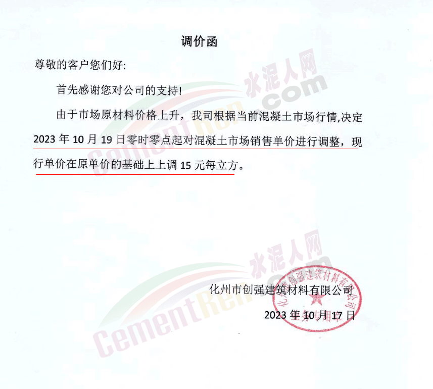 茂名化州區域混凝土企業調價通知稱,因近段時間原材料價格上漲,運營成本不斷增加,根據混凝土市場行情,上調各型號混凝土報價10~15元/立方。