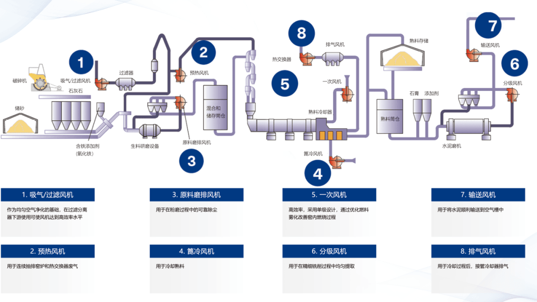 銳志風機針對水泥行業的改造升級趨勢,提供個性化解決方案,產品涵蓋1.1kW至10000kW的高性能離心風機,提供水泥行業全流程風機產品組合,完全覆蓋多樣性水泥工藝要求,幫助水泥行業客戶節能增效,可靠運行,持續優化成本,實現低碳綠色可持續發展。