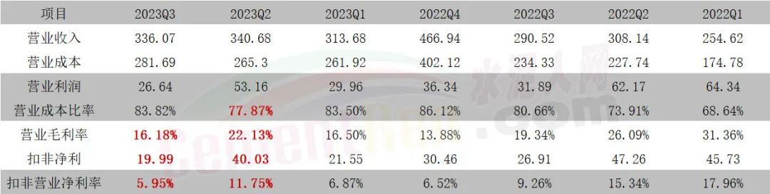 10月27日晚間,海螺水泥披露三季報,前三季度海螺水泥實現營業收入990.43億元,同比增長16.07%;實現凈利潤86.72億元,同比下降30.17%。其中第三季度實現營業收入336.07億元,同比增長15.68%;歸屬于上市公司股東的凈利潤22.04億元,同比下降14.55%。海螺水泥表示,集團水泥業務產品銷售價格下降,導致利潤總額同比減少。海螺水泥相關負責人表示,前三度業績加起來不到100億,四季度的目標是沖破100億,略低于去年。